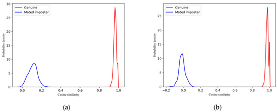 For the two queries on each dataset, we calculated the similarity score by using cosine similarity. Figure 3 is the probability distribution diagram drawn according to the query results. It can be seen from the figure that on the RaFD and Aberdeen datasets, the similarity scores of genuine queries are concentrated in the range above 0.8, while the similarity scores of mated imposter queries are concentrated in the range below 0.4. The similarity scores of the two queries are significantly different. The results show that, when the same user registers in the systems with different keys, the generated templates are significantly different. When a feature template is leaked, different keys can be used to generate new templates. That is, the proposed scheme has good revocability.