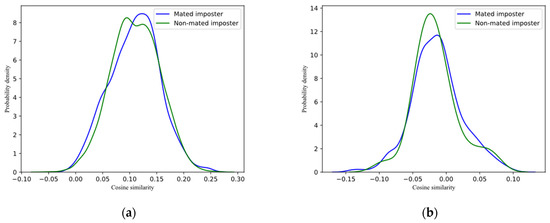 When the feature template is non-linkable, the feature template generated by the same user using different keys cannot be matched successfully in another authentication system. We verified the unlinkability of the scheme on the template databases generated in the previous subsection. For each dataset, we calculated the similarity scores of mated imposter query and non-mated imposter query between templates generated with different keys. The calculation objects of non-mated imposter query are different users in different template databases. Figure 4 is the probability distribution diagram of similarity scores, drawn according to the calculation results. It can be seen from the figure that the distribution curves of the similarity scores of the mated imposter query and non-mated imposter query of each dataset have a high degree of coincidence. According to the results of genuine queries and mated imposter queries in previous subsection, when a record in one template database is used to match in another template database, it cannot be verified, and according to the similarity score of the match, it cannot be determined whether the user corresponding to the record is registered in another template database. The experimental result demonstrates that the proposed scheme is non-linkable.