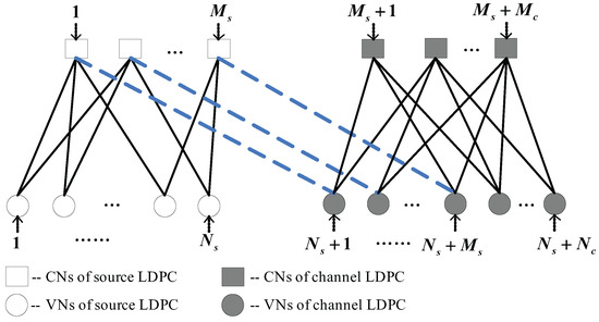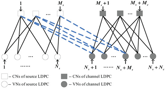 12]. In order to improve the error-floor performance, a linking matrix connecting the VNs of the source LDPC code and the CNs of the channel LDPC code, denoted as the source variable–channel check (SV-CC) linking matrix, was introduced in [
