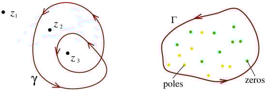Left: Three points in the complex plane and a closed contour . Right: A closed contour encircling zeros and poles of a meromorphic function .