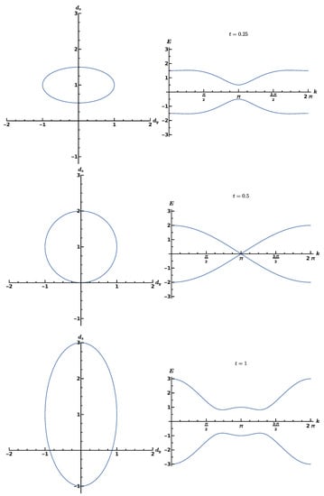 To see how topology enters, we notice that the vector describes an ellipse with parameter k on the curve, determines the position of its center, and t determine its shape. In Figure 3, we depict for fixed values of , and three different values with the corresponding energy dispersion relation . If the origin of the plane is included in the closed contour that the ellipse describes, its winding number is one, . If not, the winding number is zero, . These are two topologically separated scenarios, reflecting the distinctly different role of the Majorana fermions in the top and bottom parts of Figure 2. For , the superconducting phase is the normal or trivial one, while it is topological for . A special situation occurs if the ellipse just touches the x axis, the band gap disappears, marking the phase transition point.