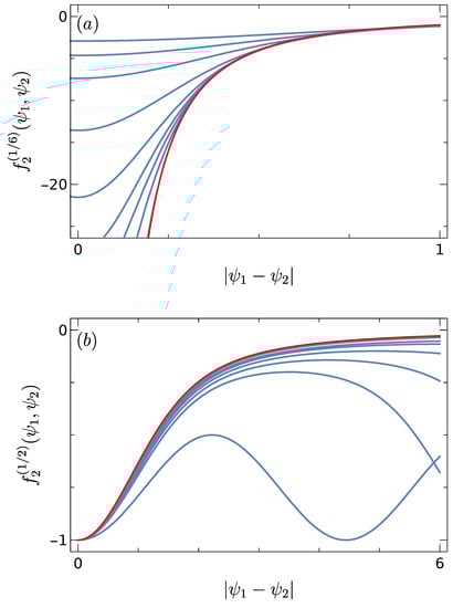 We notice , see Equation (32), implying that when taking the limit for arbitrary . The result (38) reveals different regimes, the one for involves the same scale as in Refs. [8,9]. Figure 4 shows results for two values of and various values of N, the unfolded two-point function approaches the limit (38) when N increases. We conjectured that the function is universal [1].