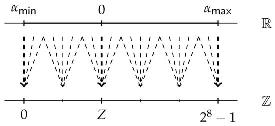 where is called scale, and is called zero-point. As pointed out by Jacob et al. [], both S and Z are determined at the training phase of the neural network; thus, is a constant parameter in the inference phase. We use a single set of quantization parameters for each activation array and weights array in the same neural network layer.