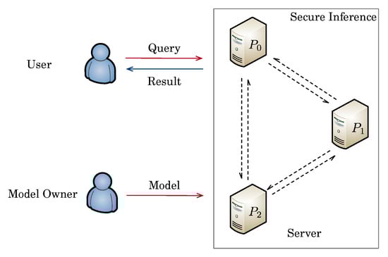 As an essential application of machine learning as a service (MLaaS) [], neural network inference is widely used in image recognition [,], medical diagnosis [], and so on. In the traditional MLaaS paradigm, the model owner provides a trained neural network, and a user, who holds some queries, calls an API of MLaaS to enjoy the inference service. However, with the increase in people’s privacy awareness and the perfection of laws and regulations [], the traditional MLaaS paradigm is being challenged. On the one hand, the user is unwilling to reveal queries and inference results to the model owner. On the other hand, the trained model is intellectual property belonging to the model owner and cannot be revealed to the user. Secure inference utilizes cryptographic techniques to ensure that sensitive information is not revealed to each other.
