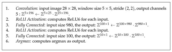 We consider the convolutional neural network presented in Chameleon [], which includes a single convolution layer and two fully connected layers. The activation function is ReLU activation. We consider its quantized variant as our QNN structure and describe it in Figure 3. As we pointed out above, we set all data types of QNN from FP32 to INT8.