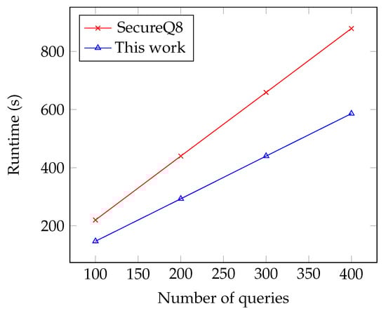 Our protocols also enjoy the benefit of the offline–online paradigm. Specifically, most of the communication cost of the online phase is transferred to the offline phase, which makes our scheme more efficient than SecureQ8 in the online phase, especially in the WAN setting. To see this more clearly, we also plot a performance comparison of batch inferences in Figure 4.