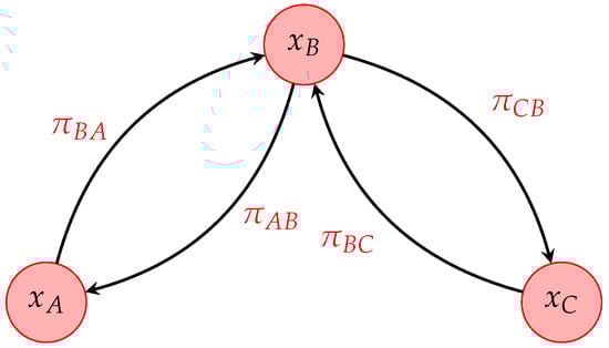 When , the system is linear, and all the transitions are equally likely, whereas on the opposite, when , a large fraction of particles in states A and C drops the transition rates toward state B, leading to bistability. This model can be interpreted as a Markov process on a graph whose time evolution is governed by Equation (16). It is possible to compute the critical condition for the bifurcation of the symmetric equilibrium for the average self-consistent Equation (7):