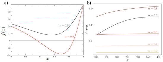 Figure A1c shows the -error as a function of , which is approximately linear for small , far from the bifurcation, and increases monotonically for increasing values of . At the bifurcation, there is the emergence of abrupt changes in the monotony of the function. Moreover, we note once again that far from the bifurcation, there is no dependence on N, as expected theoretically.
