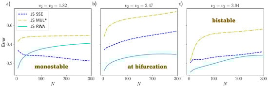-error with respect to the Runge–Kutta numerically integrated distribution vs. the number of particles N for the PdPC model. The colors refer to multinomial approximation (dashed–dotted yellow, referred to as MUL), System Size Expansion (dashed blues) and Random Walk Approximation (solid cyan): (a) Monostable state with control parameter . (b) Close to criticality with . (c) Bistable with . The other parameters are set to for all plots.