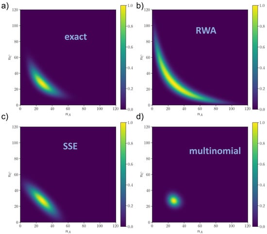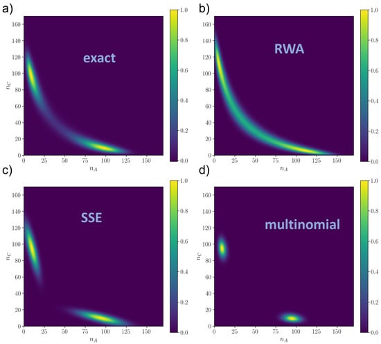 Finally, we note that the numerical RK solution was compared with the solution obtained by means of the Gillespie algorithm [18] to ensure that the numerical integration was arrived at convergence to the stationary state. The results were exactly the same either considering the numerical integration or the Gillespie Monte Carlo simulation as benchmark, and therefore, the RK integrated solution can be considered as the “true” solution of the ME.