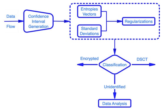 The proposed method is intended to detect encrypted data and data in the DSCT format that are transported through the network, excluding data that are in unencrypted, but which are also compressed. This method consists of applying an algorithm that, for the data it receives and has to classify, estimates the entropies and calculates the standard deviation values. Based on the values of the standard deviations, for which the algorithm tests belonging to the established confidence intervals, the algorithm classifies the data as DSCT, encrypted, or unidentified data. In addition to the proposed algorithm, the way to determine the confidence intervals is also presented.