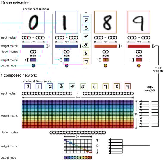 Illustration of the composite network. For each of the ten numerals, an independent neural network (sub-network) is trained to recognize a single numeral among the others. Each of those ten networks has 784 input nodes to receive data from the pixel-wide MNIST images. Each hidden layer has two nodes followed by a single node at the output layer (top panel). The composite network (bottom panel) is assembled from these ten subnetworks. Colors represent which weights in the combined weight matrix come from which corresponding sub-network. Weights shown as white remain . Consequently, the weight matrix connecting the hidden layer to the output layer is de facto sparse.