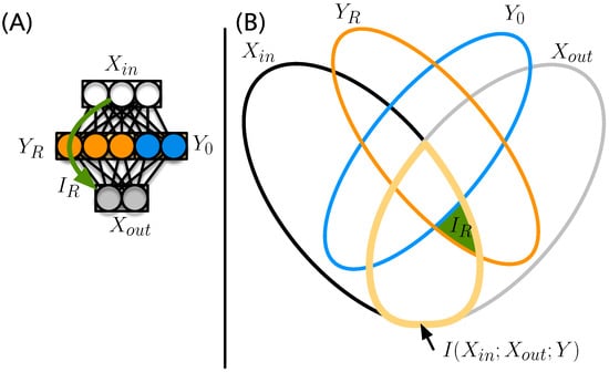 (A) Input/output structure of an ANN with inputs , outputs , and a hidden layer . The relay information passes from the inputs via the relay neurons to the output (green arrow); (B) the entropic Venn diagram for the four variables , , , and , with ellipses quantifying the entropy of each of the variables colored according to (A). The information shared between and is outlined in yellow. The relay information Equation (3) is indicated by the green area.