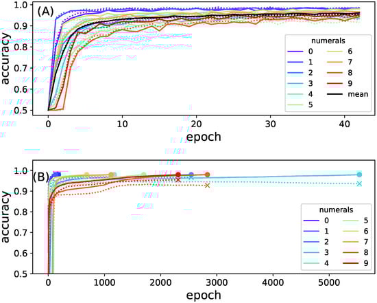 Training accuracy as a function of training epoch. (A) full model (top panel). The accuracy to predict each numeral is indicated with lines of different colors (see legend). Accuracy on the training set is shown as solid lines while accuracy on the test is indicated by dotted lines. The average performance classifying all numbers is shown in black; (B) accuracy of each of the ten sub-network models used to create the composite model as a function of training epoch. Colors indicate the accuracy for detecting an individual numeral. The endpoint of the training is highlighted with a dot; the same time point but using test data is indicated by an x. Training other networks had marginally different outcomes.