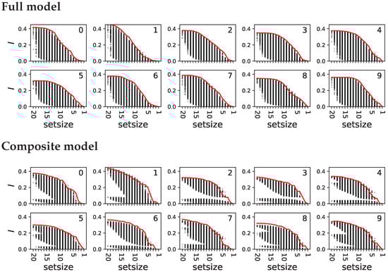 Particular relay information about each numeral for all possible bi-partitions (black dots) as a function of the set sizes . The top ten panels show particular relay information for the full model, while the bottom ten panels show the same for the composite model. Each panel shows the relay information about a different numeral in the MNIST task, indicated by the index of the panel. The red line corresponds to the set identified by the shrinking subset aggregation algorithm. Fewer than 0.9% of all subsets have a higher information content than the one identified by the algorithm.