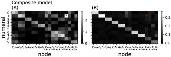 Aggregated relay information and essentiality in the composite model. (A) aggregated particular information loss (Equation (8)) for all 20 nodes in the hidden layer (x-axis) and the ten different numeral classes (y-axis) shown in grayscale (brighter shades indicate higher loss of information); (B) node essentiality (Equation (7)) for each hidden neuron and numeral. Bright squares indicate essential nodes, while black squares would indicate redundant or meaningless nodes. The red dot (node 16, numeral 1) points to a neuron that appears to relay information (A) but is entirely redundant and non-essential (red dot in (B)).