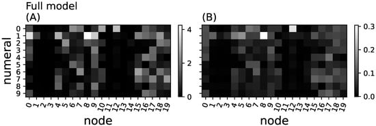 Aggregated relay information and essentiality in the full model. (A) aggregated relay information for each node and every numeral class for the full network; (B) essentiality. Methods, axes, and grayscales as in Figure 6.
