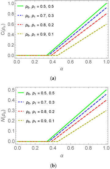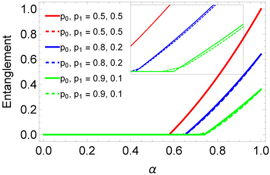 because and is a positive number. For a maximally entangled state, the Equation (29) also gives for entanglement retain and can be observed from Figure 3b.