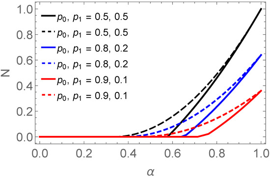 We can also evaluate the transferred entanglement between qubits A and D in terms of negativity. As all density matrices of qubits A and D in Equations (33) and (34) have X-form state, hence, their negativity can easily be computed by Equation (28). The state and have the same amount of negativity and take the form