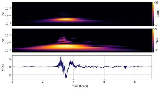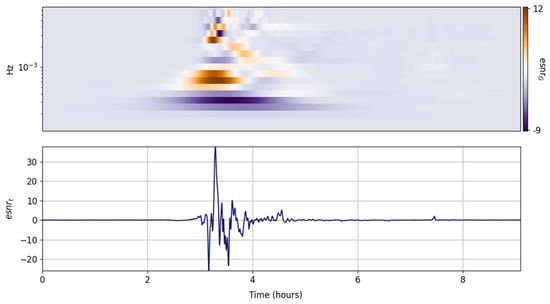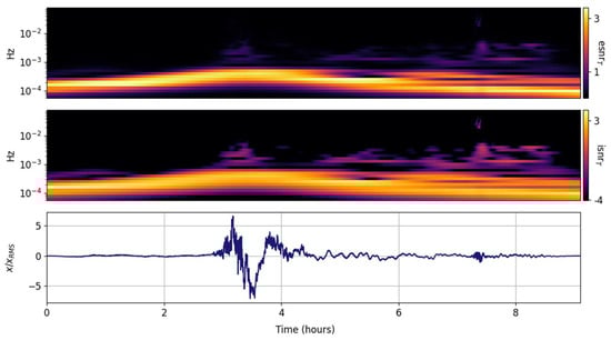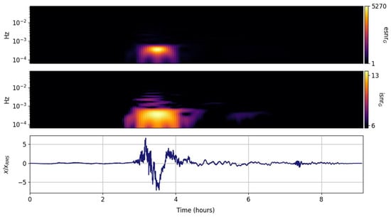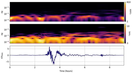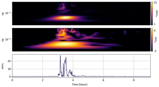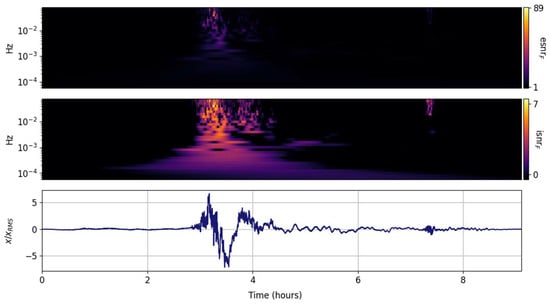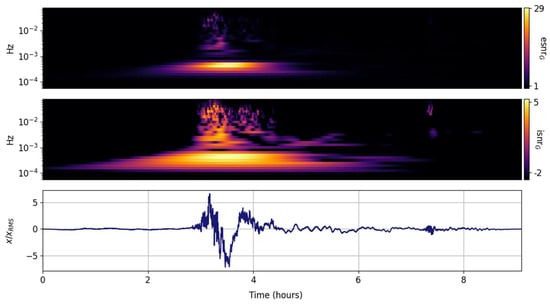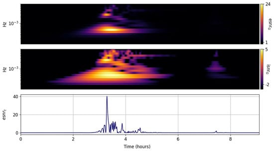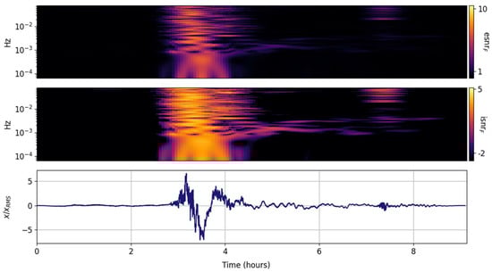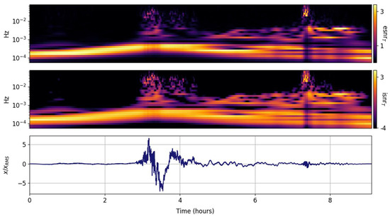Spectral entropy is a nonlinear transformation that can concentrate energy to improve signal feature extraction e.g., []. Like spectral power, it is additive and can be rescaled and normalized in different ways to enhance features associated with sources or physical regimes of interest. Nonlinear transformations are useful for exploratory analyses as well as ML applications. Mallat [] goes into more detail in the context of convolutional neural networks, which are generally computed using a cascade of linear and nonlinear transformations that can reduce data variability in the direction of local symmetries. An essential part of the signal exploration stage is to identify these local symmetries in cyberspectral space and select methods to enhance features that can provide additional information.