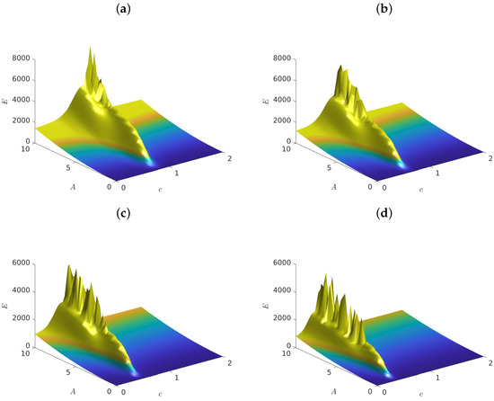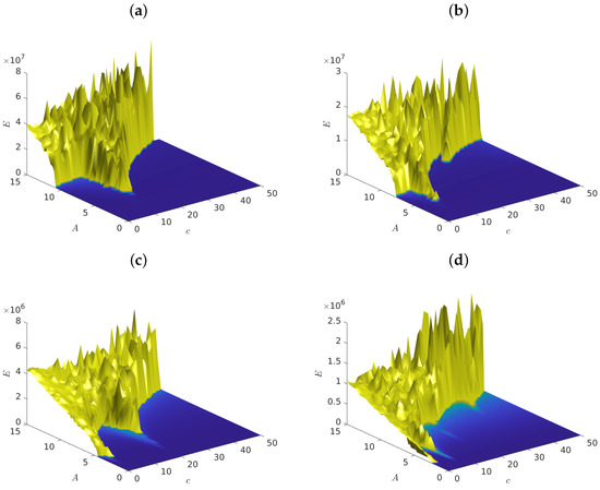Graphs of the total energy of system (6) versus the driving amplitude A and c, for (a) , (b) , (c) and (d) . We used , fixed and the time step size was equal to .