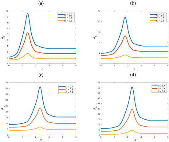 Next, we proceeded to study, in Figure 2, the same Case II example with and , with all other parameters the same as in Figure 1. The important difference here was that we chose driving frequencies smaller than 1 in the different plots: (a) , (b) , (c) and (d) .