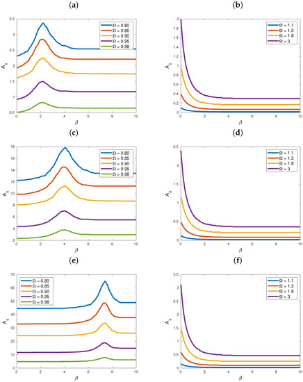 Observe first the general behavior of vs. for in Figure 4a,c,e: note the presence of a local maximum in the graphs, which shifted to higher values of as c diminished from 0.9 (top row) to 0.4 (middle row) and 0.2 (bottom row). Clearly, for these frequencies, the location of the maximum increased for higher . Note first that, in all these figures, all critical amplitudes increased as c decreased, in agreement with the results of previous sections.