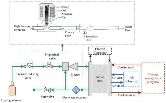 PEMFC system and hydrogen subsystem with proportional valve and ejector.