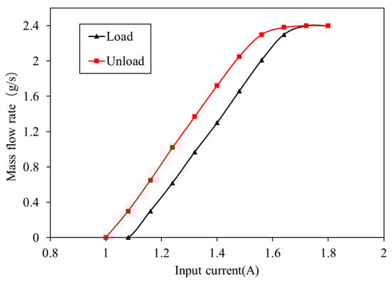 The experimental process was as follows: the gas source supplies sufficient hydrogen and the inlet pressure was set to 12 bar; the outlet pressure was set to 1.5 bar. The rated control voltage of the proportional valve was 12 V, and the input current range of the proportional valve was from 0 to 1.8 A. The opening of the proportional valve was controlled by changing the input current of the proportional valve. During the loading and unloading process, the hydrogen mass flow rate corresponding to the input current value was collected. In the loading process, the minimum opening position current of the spool was about 1.08 A, and the maximum current of the spool was about 1.72 A. In the unloading process, the maximum position current of the spool was about 1.64 A, and the minimum opening position current was about 1.00 A.