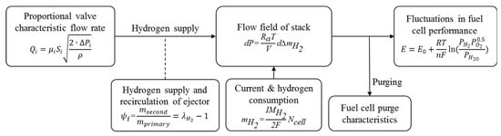 Optimal design and advanced control of electrochemical reactants in PEMFC are essential to improving the durability and stability of commercial applications [14]. In general, excess supply of hydrogen and oxygen reactants to PEMFC’s electrochemical reaction flow field is necessary to prevent reactant starvation. Excess hydrogen is recirculated in a PEMFC’s flow field, which promotes gas mobility, and further minimizes the storage amount of liquid water generated by electrochemical reaction in the PEMFC’s flow field. In this way, it can avoid flooding and the degradation of the PEMFC’s performance. In addition, the higher reactant flow rate (recirculation amount) can keep the reactant concentration high and improve fuel utilization and fuel cell performance [15].