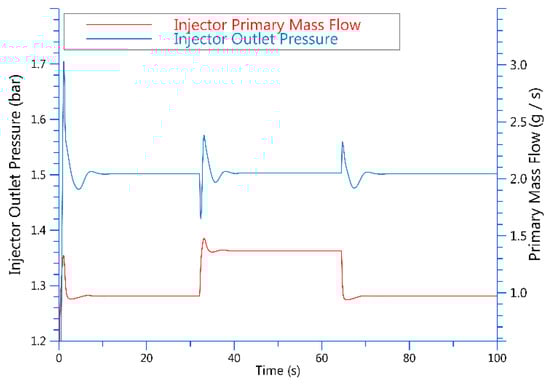It can be seen in Table 1 that when the control current of the proportional valve is 1.32 A, the hydrogen flow rate is 0.97 g/s in loading and 1.37 g/s in unloading. In Figure 6, simulation results show that the ejector flow changes with the changes in control. The ejector hydrogen outlet is connected to the stack inlet, and the stability of stack pressure can be ensured by keeping the ejector outlet pressure stable. In the model, the pressure can be stabilized by adjusting the PID of the pressure regulating valve. The pressure at the ejector outlet and the stack in the simulation model can basically stabilize at the demand pressure of 1.5 bar.