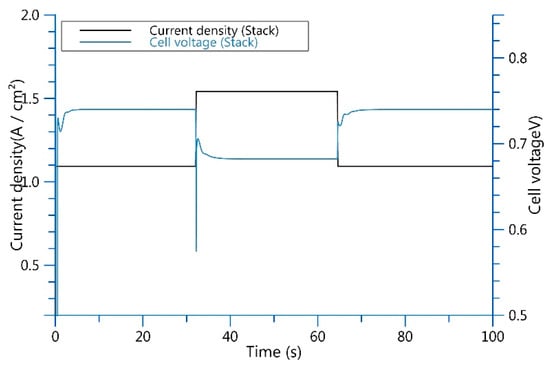 There is a characteristic relationship between stack voltage and current in fuel cells. When stack current increases, the voltage decreases, which is mainly due to the voltage loss caused by electrochemical activation, concentration polarization and internal resistance. The voltage in the simulated dynamic change process was calculated by Equation (10).
