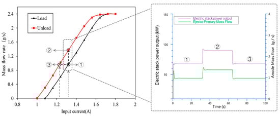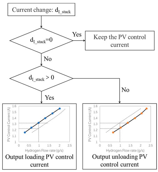 As shown in Figure 9, without compensation control, when the PV control current is 1.32 A, the deviation between power point ① and power point ② is obvious. If combined with the compensation method in Figure 8, the compensation PV control current becomes 1.23 A in unloading, and the hydrogen supply flow rate at power point ③ is about 0.97 g/s. The power point ③ after compensation is the same as that of power point ①, and the compensation mode can ensure the stability of stack-power output.