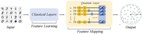 Hence, we built our QHDNN solution and conducted further research on the basis of method (b). Figure 3 shows the general structure of our QHDNN. In our architecture, the pooling layers and convolutional layers were kept the same as in a classical DNN, while the quantum layer was adopted to replace the final FC layer for feature mapping.