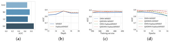Training Set Size and Epochs: The size of the experimental training set and the number of training epochs may also have affected the performance of our solution. As presented in Figure 5c, our QHDNN achieved good performance when the size of the training set was varied from 250 to 450, and it showed high stability on both MNIST and FashionMNIST. As shown in Figure 5d, when the number of training epochs was changed from 8 to 16, the performance of the QHDNN could be maintained at a good level. However, when the number of epochs was further increases beyond 12, the AUCs of both the QHDNN and the classical DNN started to decline, which was probably due to the overfitting problem. Interestingly, we found that the performance of the hybrid method was more robust than that of its counterpart.