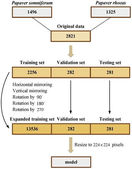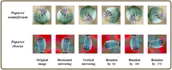 - To improve the model’s feature-extraction and generalization ability and avoid the problems of overfitting and low classification accuracy caused by a small sample dataset, the capsule image training set was expanded using common data expansion methods in deep learning [28], that is, horizontal mirroring, vertical mirroring, and rotation by 90, 180, and 270 degrees, respectively, as shown in Figure 2. As in Figure 1, the capsule images in Figure 2 are resized to a consistent size. The expanded training set includes 7170 Papaver somniferum capsule images and 6366 Papaver rhoeas capsule images;