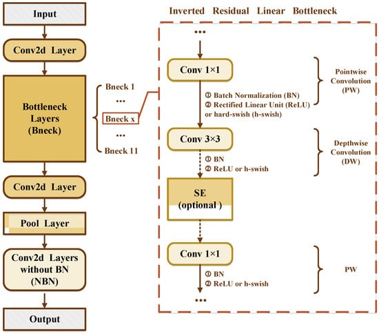 MobileNetV3, as part of a new generation of lightweight networks, builds on MobileNetV1 and MobileNetV2 by combining deep separable convolution and an inverse residual structure with a linear bottleneck to improve computational efficiency and effectively extract feature information. It uses platform-aware Neural Architecture Search [40] and Neural Network Adaptation [41] to optimize the network structure and parameters. A Squeeze-and-Excite (SE) [24] channel attention module further improves network performance and operational efficiency. Figure 4 shows the MobileNetV3 structure.