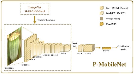 We propose a P-MobileNet model based on transfer learning and a modified MobileNetV3-Small model to lower the model’s data requirements while improving operational efficiency. Figure 5 shows the P-MobileNet model structure, which consists of a pre-trained MobileNetV3-Small model on the ImageNet dataset and a modified MobileNetV3-Small model.