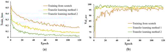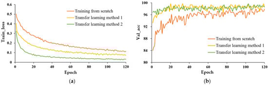 The train_loss curve and val_acc for the three learning methods are shown in Figure 6 and Figure 7, respectively. In both cases, P-MobileNet trained from scratch had the slowest convergence rate with large fluctuations, and the loss function presented a high loss value after stabilization. The model with TL_M2 had the fastest convergence speed and lowest loss value. The accuracy of P-MobileNet trained from scratch was the lowest and fluctuated greatly. The accuracy of the model with transfer learning fluctuated less, among which the accuracy of TL_M2 was the highest. The SD of val_acc for TL_M2 under unexpanded data was decreased by 3.354 percentage points compared to that for training from scratch.