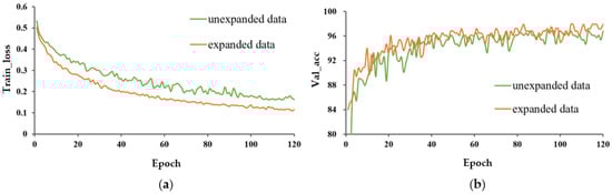 The train_loss and val_acc for the expanded and unexpanded datasets under three different training methods are shown in Figure 8, Figure 9 and Figure 10. For these three different learning methods, a general phenomenon was observed, namely that the loss function of the model trained on the expanded capsule image dataset was lower and less volatile than that on the original dataset. From Table 2, for training from scratch, TL_M1, and TL_M2, the test accuracy under expanded data was 1.4, 0.7, and 0.3 percentage points higher, respectively, than that for training on the original data; the SD of val_acc under expanded data was decreased by 2.924, 1.115, and 1.429 percentage points compared to that trained on the original data, respectively, which indicated that data expansion could improve the classification accuracy and robustness of the model.