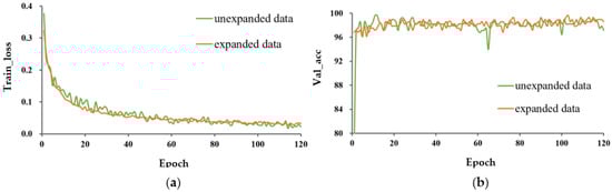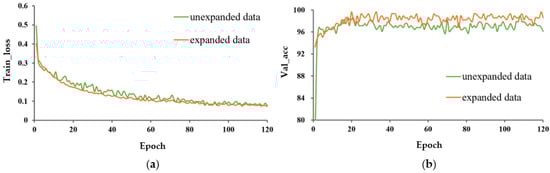 After 120 training epochs, a comparison of the performance of P-MobileNet under different learning methods and data expansion methods is shown in Table 2. In addition to the accuracy, precision, recall, and F1 values of the testing set, we also calculated the standard deviation (SD) of the training loss (train_loss) and the accuracy of the validation set (val_acc) to measure the volatility of the data.