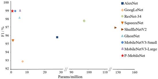 We compared the performance of the models based on F1 and the number of parameters, as shown in Figure 11, where the horizontal scale is the number of parameters and the vertical scale is F1. P-MobileNet had the highest F1 with the fewest parameters.