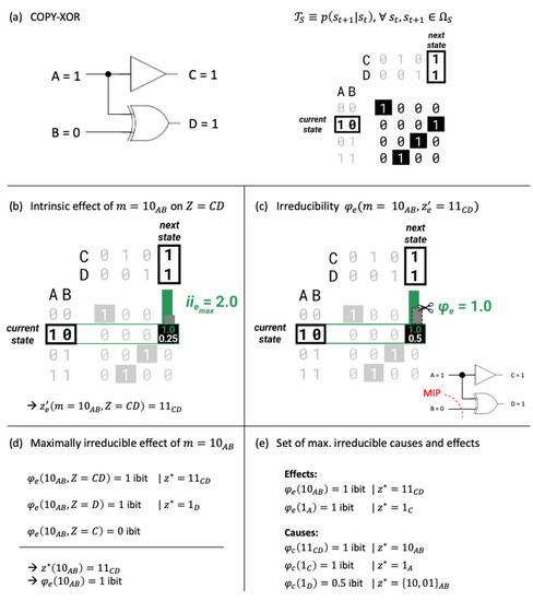 Outline of the IIT analysis applied to a classical COPY-XOR gate. (a) The COPY-XOR gate and its (deterministic) transition probability function depicted by a probability matrix. To avoid a proliferation of subscripts, in the following we use different letters to denote inputs and outputs. For conceptual ease, and can (but do not have to) be interpreted as the same physical units before and after the update. Unit C is a copy of the input bit A, and D corresponds to an XOR function of both input bits (). For input state (also denoted by ), the COPY-XOR gate outputs (denoted by ). (b) Based on , we can identify the intrinsic effect of a mechanism M in its current state m over a purview Z as the effect state with maximal intrinsic effect information . For and , the intrinsic effect is . (c) Next, we assess the irreducibility of the intrinsic effect by computing the integrated information over the minimum partition (MIP). (d) To identify the maximally irreducible effect of a mechanism m, we compare across all possible effect purviews Z. Here, the maximally irreducible effect of is because it specifies a maximum of and is the largest purview that does so (see text for details). (e) For a given system, we identify all maximally irreducible causes and effects. Given the input state , the classical IIT analysis identifies two irreducible effects; the first-order mechanism specifies the effect , and the second-order mechanism specifies the effect . Given the output state , the IIT analysis identifies three irreducible mechanisms, including mechanism with purview or (which are tied). Both intrinsic information () and integrated information () are quantified in “ibit” units (see text below).