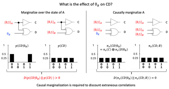 Causal marginalization. Let us assume we want to identify the effect of the input bit (or ) on the output in the COPY-XOR system of Figure 1. Intuitively, by itself, does not have an effect on C, as it does not input into C. It also has no effect on D because, by itself, it specifies no information about the output state of the XOR D. However, simply marginalizing the input A (averaging over all possible input states of A while maintaining the common inputs from A to C and D) would result in a “spurious” correlation between the output bits that is not due to B, but instead due to the common inputs from A. Capturing the fact that , by itself, has no effect on , requires causal marginalization (independent marginal inputs to each unit in the effect purview).