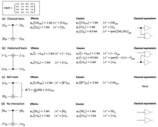 CNOT gate. The CNOT operator is shown in the top box. (a) For a pure input state in the classical basis, we obtain the same results as in the classical case (Figure 1). (b) For a pure input state in the Hadamard basis, the role of the “control” (here B) and “target” (here A) is reversed compared to (a) (as indicated in the circuit diagram). (c) The CNOT is often used to produce a “Bell state” of two maximally entangled qubits. In this exclusively quantum scenario, only the second-order mechanisms and specify an effect or cause, respectively. None of the subsets has any cause or effect information ( ibit). (d) Conversely, given the input state , all second-order mechanisms are fully reducible ( ibit) and only the first-order mechanisms specify causes and effects.