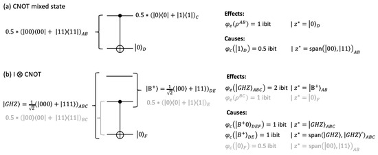 Next, we consider the case of purviews comprised of multiple units (). In the classical case, units in may induce correlations between units in Z, as shown in Figure 2 by example of the COPY-XOR gate. The quantum equivalent of a classical COPY-XOR gate is the CNOT gate (Figure 3). For classical inputs, the CNOT behaves identically to the COPY-XOR gate and thus the same considerations apply. This means that, also in quantum systems, extraneous correlations should be discounted when evaluating the causal constraints of a system subset M, since they do not correspond to constraints due to the mechanism M itself. In the following, we will use to denote , while corresponds to the final effect repertoire, after discounting extraneous correlations.