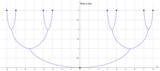 Dendrogram displaying bifurcation structure for reconstruction points for the dataset (−8, −7, −4, −3, 3, 4, 7, 8) with squared Euclidean distance as distortion function. Bifurcations happen for the rate 1 bit and the rate 2 bits where the rate distortion function on Figure 2 has elbows.