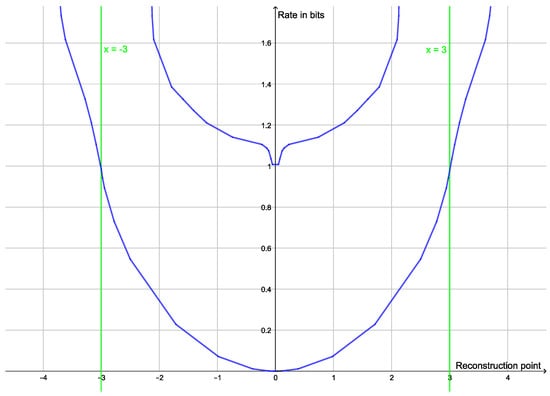 Here, 200 data points are compressed. Of these, 100 were generated by and 100 were generated by This corresponds to a signal of X that is a binary variable which is uniformly distributed on and Gaussian noise The rate of the signal is 1 bit. At rates below 1 bit, the values of are compressed into two reconstruction points lying symmetrically around 0. At rate 1 bit, we recover the signal At higher rates, we start to compress the noise. A reconstruction point at 0 bifurcates into 2 reconstruction points that move towards . The situation stabilizes when the two reconstruction points around 3 (and the two around −3) are at approximately the same distance. At higher rates, more and more new reconstruction points will emerge.