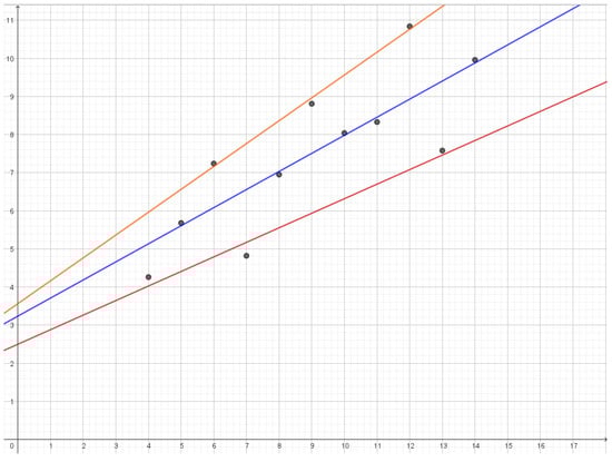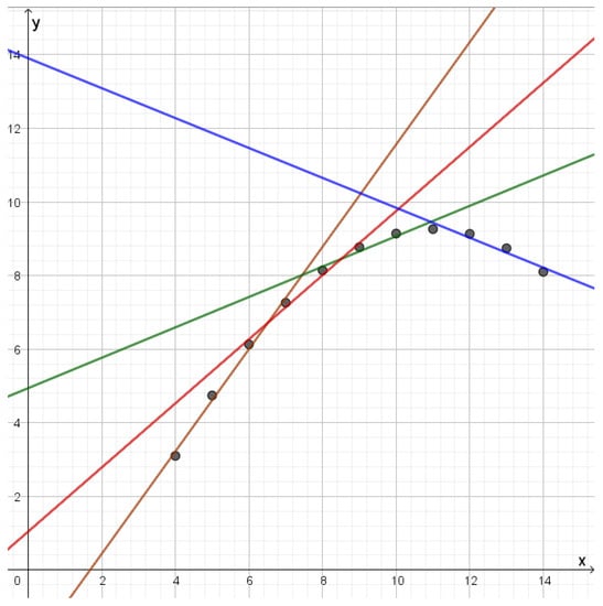 Reconstruction lines for the second dataset in Anscombe’s quartet. The different lines each approximate a certain part of the data set. Since the points lie on a parabola the brown line has a slope that is quite different from the slope of the blue line, while the red line and the green line represent slopes that are in between.