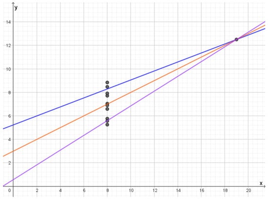 Reconstruction lines for the first dataset in Anscombe’s quartet. As the rate is lowered the orange line and the red line will move towards the blue line.